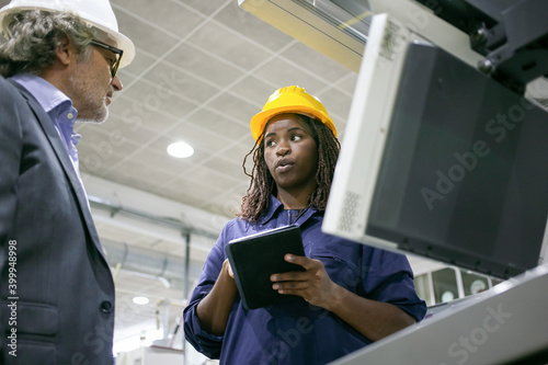 Serious black female factory employee talking to boss at her workplace on plant floor, using tablet and speaking. Low angle. Production process or machinery concept