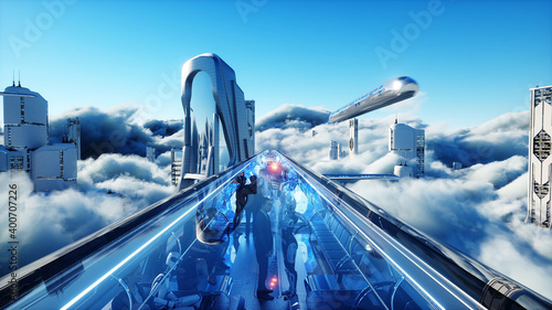 Flying passenger train. Futuristic sci fi city in clouds. Utopia. concept of the future. Aerial fantastic view. 3d rendering.