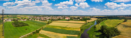 Rzeka miedzy polami latem w miasteczkiem w tle