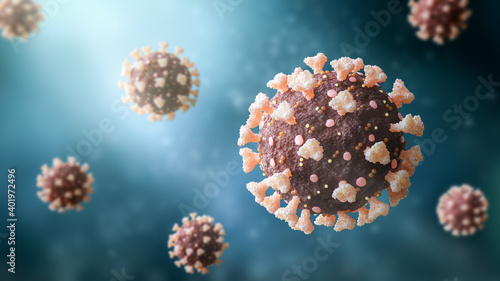 Coronavirus or sars-cov-2 or covid-19 virus cells 3D rendering illustration. Medical and healthcare, medicine, microbiology, virology, science concepts.
