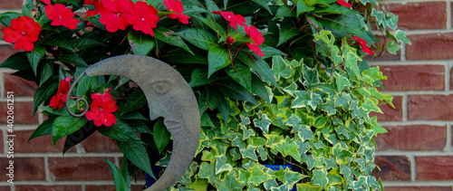 red impatience flowers and trailing ivy in a garden with a moon guarding the plant