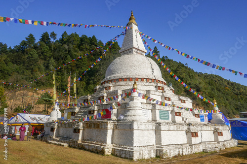 Buddhist monument Chendebji chorten near Trongsa in Central Bhutan is a stupa built in the Nepalese style decorated with prayer flags and banners during annual festival