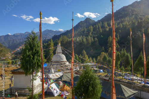 Buddhist monument Chendebji chorten near Trongsa in Central Bhutan is a stupa built in the Nepalese style seen with prayer flags and banners during annual festival