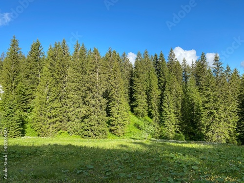 Evergreen forest or coniferous trees over the Iberig region and on the slopes of the Schwyz Alps mountain massif, Oberiberg - Canton of Schwyz, Switzerland (Kanton Schwyz, Schweiz)