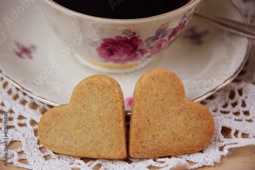Dwa ciasteczka serca przy kawie, słodkie Walentynkowe serduszka