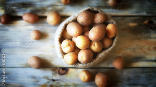 Selective focus. Macro. Small young potato in a bucket. Mini potatoes.