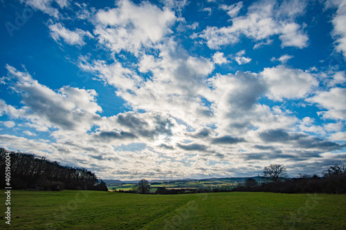 green field and beautiful mountain panorama at billiger berg near eiffel in the sun at euskirchen, germany