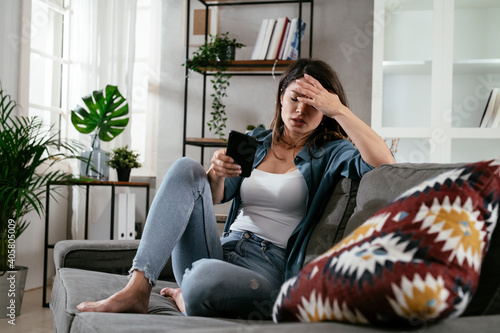 Sad woman sitting on the couch, using the phone. Upset woman waiting for a phone call...
