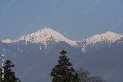 雪が残る山の稜線の写真素材