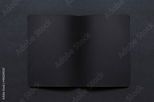 Cuaderno abierto color negro sobre fondo negro. Espacio libre para texto o fotos.