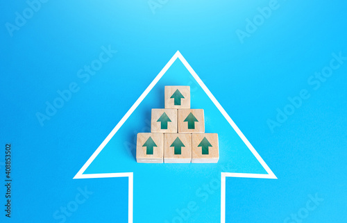 Blocks with unidirectional arrows united in a single move arrow. Directing all efforts and resources to achieve the goal and solve an urgent problem. Mobilization efforts. Consolidation. Organization