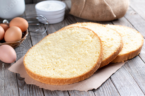 Sponge cake or chiffon cake, so soft and delicious with ingredients: eggs, flour, milk on table. Homemade bakery concept for background and wallpaper.