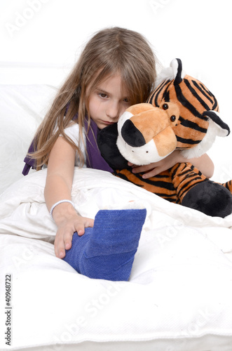 Kind mit Gibsfuß ist traurig