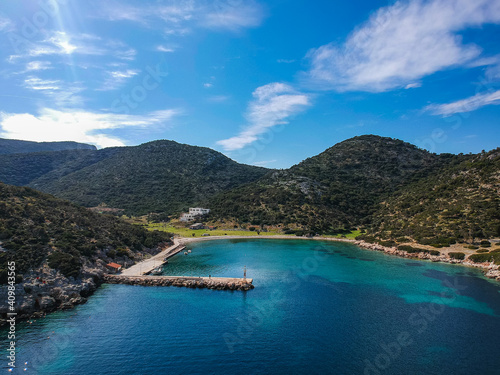 Aerial panoramic view of the picturesque old harbor Gerakas in northern Alonnisos, Greece. Beautiful scenery with rocky formation and natural fjord-like bay in Sporades Aegean sea, Greece