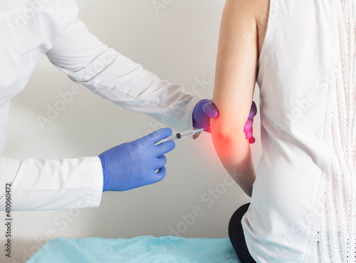 The doctor gives the patient an injection intraosseous medical blockade to relieve pain in case of rupture of ligaments and fracture of the elbow joint, therapy