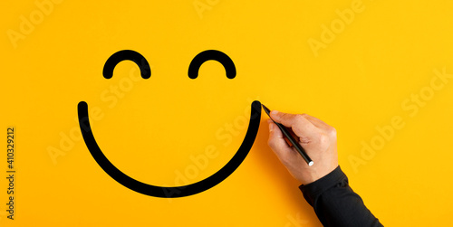 Male hand drawing a smiling happy face sketch on yellow background. Client satisfaction, service or product evaluation