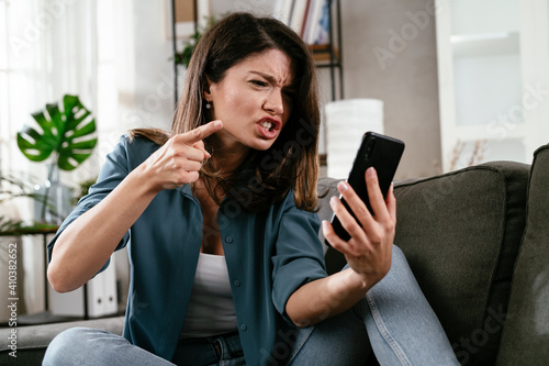 Sad woman sitting on the couch, using the phone. Upset woman waiting for a phone call.