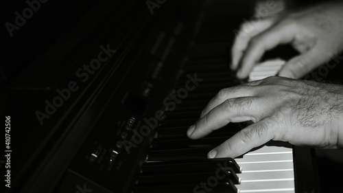 Manos de hombre de media edad tocando el piano, foto en blanco y negro