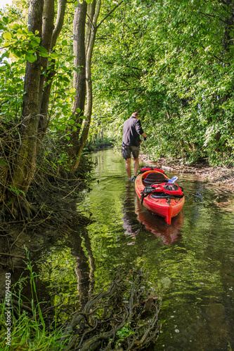 Mężczyzna podczas spływu kajakowego ciągnący kajak w płytkiej rzece