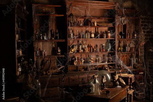 Halloween background Shelves with alchemy tools Skull spiderweb bottle with poison candles