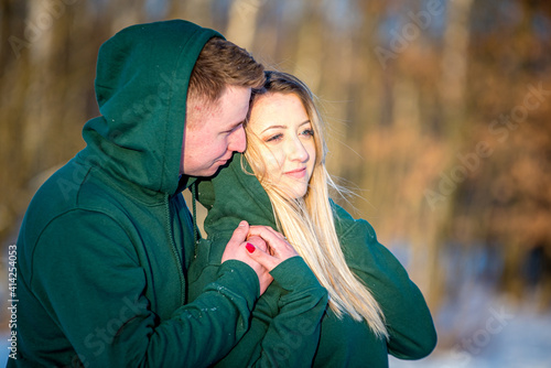 zakochana para, dziewczyna i chłopak na sesji narzeczeńskiej w zimie