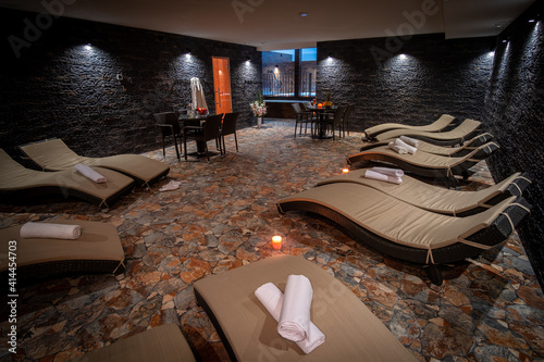 Wellness relax room. Sofas, chairs and couchette set up. Table with fruit and a candle.