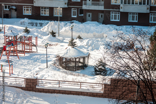 a playground, rotunda, fence and some trees in the yard of an apartment building covered by snow