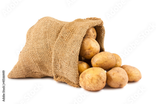 Raw potatoes in burlap sack