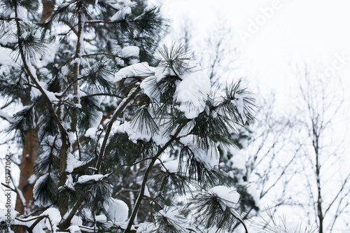 Sosna zasypana śniegiem, gałęzie drzewa iglastego pokryte śniegiem