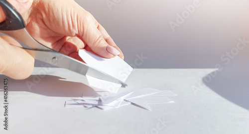 A woman's hand cuts a sheet of white paper with scissors and cuts off the corners. Close-up, DIY concept