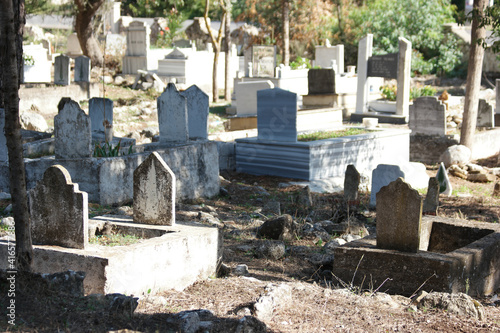 Tombstone and graves in an ancient Muslim graveyard. Old islamic cemetery background.