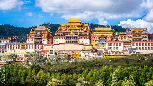 Ganden Sumtseling monastery main buildings scenic view with golden roofs surrounded by green nature Shangri-La Yunnan China