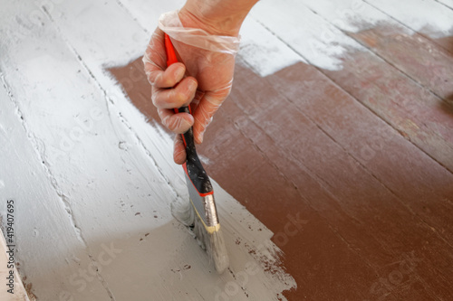 Malowanie starej podłogi z desek na kolor jasnoszary.
