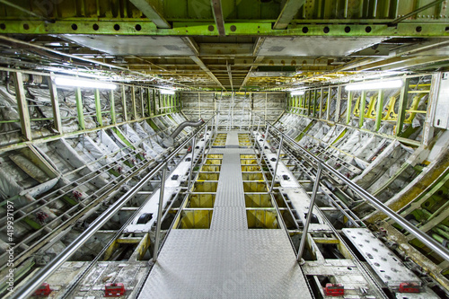 Inside view of airplane fuselage lower deck cargo hold