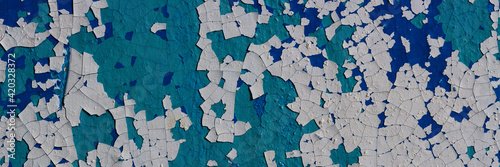 Peeling paint on the wall. Panorama of a concrete wall with old cracked flaking paint. Weathered rough painted surface with patterns of cracks and peeling. Wide panoramic grunge texture for background