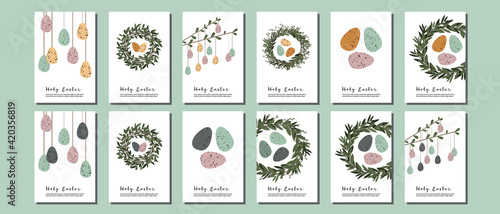 Easter cards. Cute easter egg, nest, branch and leaves. Eco rustic decoration. Vector flat cartoon illustration. Perfect for poster, print, card, invitation, greeting, tag