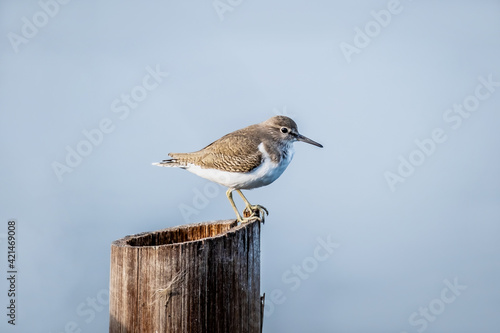 Common sandpiper (Actitis hypoleucos) Standing on a wooden