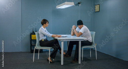 Killer man interrogated by police woman in a dark room requires a lawyer
