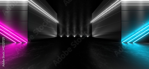 Sci Fy neon lamps in a dark tunnel. Reflections on the floor and walls. 3d rendering image.