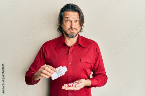 Middle age handsome man taking pills puffing cheeks with funny face. mouth inflated with air, catching air.