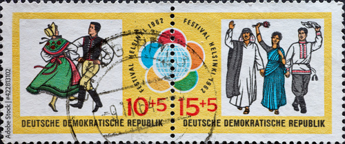 GERMANY, DDR - CIRCA 1962 : a postage stamp from Germany, GDR showing folk dance couple in costume and young people from different nations. World Festival of Youth and Students in Helsinki 1962