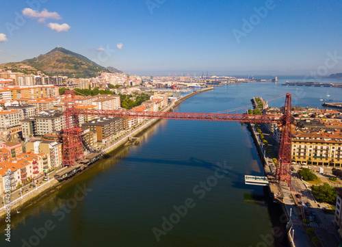 Aerial view of modern Vizcaya bridge crossing river at Portugalete, Spain