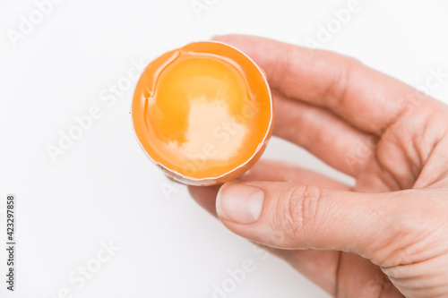 A hand holding brown chicken egg with yellow yolk is half broken against white background