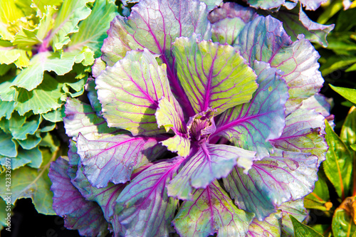 gros plan sur un plan de chou en été avec veines mauves et feuilles colorées
