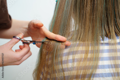 haircut. mom cuts off her daughter's hair with scissors.