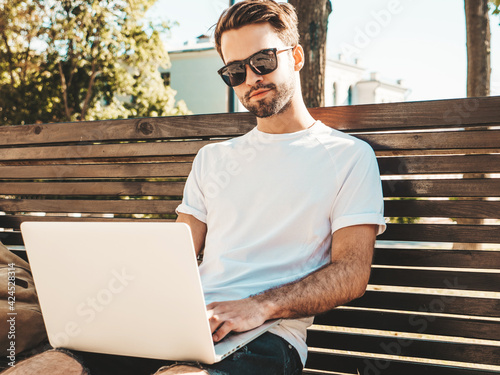 Handsome smiling stylish hipster lambersexual model. Fashion man sitting on the bench in the street and using laptop computer, writing text. Concept of co-working startup. Technology and communication