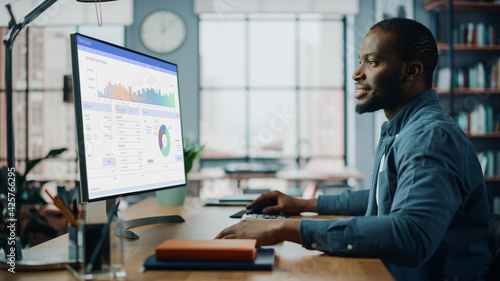 Handsome Black African American Specialist Working on Desktop Computer in Creative Home Living Room. Freelance Male is Doing Market Analysis and Creates Report with Charts for Clients and Employer.