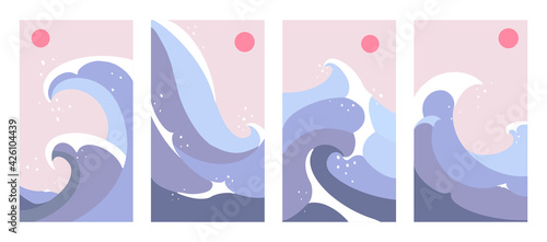 Boho wall decor. Abstract contemporary aesthetic set of mid century landscapes with sun and waves. Boho wall decor. Flat minimalist design.
