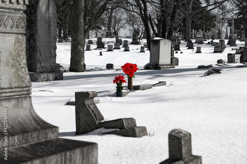 Red roses in the cemetery in the winter with snow