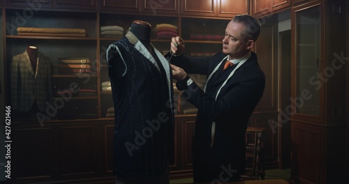 Cinematic shot of professional tailor taking measurements for creation of custom high quality tailored suit in luxury tailoring atelier.Concept of fashion, handmade, hand craft, couturier and business